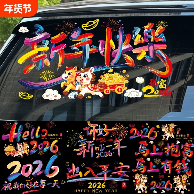 版权保护: 转载本文请保留链接: 你好2026新年快乐汽车贴大吉祝福春贴马过年窗花装饰贴电动车贴纸