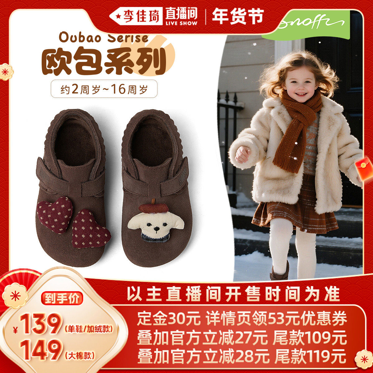 【李佳琦年货预售母婴节】斯纳菲女宝皮鞋儿童加绒新年红博肯棉鞋