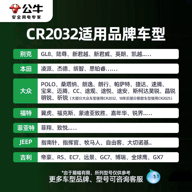 版权保护: 转载本文请保留链接: 公牛纽扣电池CR2032/CR2025/CR2016汽车钥匙遥控器纽扣电池温度计电子秤遥控器欧姆龙体温计汽车钥匙3v电子