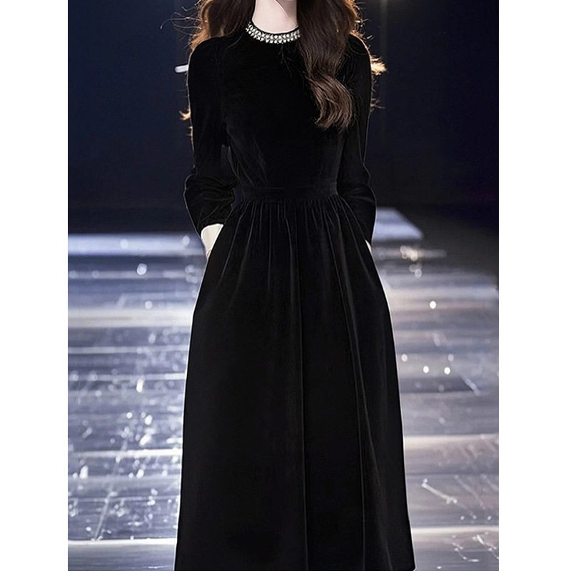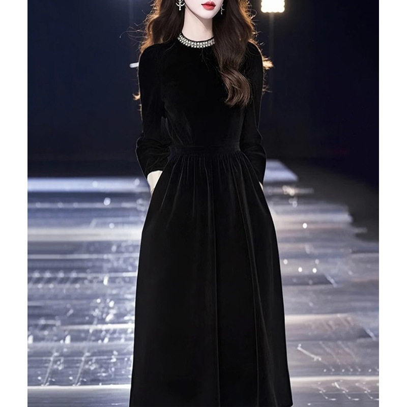 版权保护: 转载本文请保留链接: 秋季女装重要场合阔太太洋气高贵大方得体的黑色丝绒长袖连衣裙子