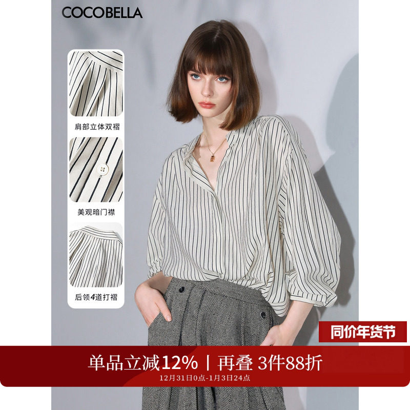 COCOBELLA设计感小立领黑白条纹衬衫外套女仿棉麻休闲衬衣SR001