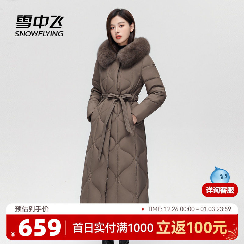 雪中飞2025冬新款超长款羽绒服女冬气质系带狐狸毛领连帽保暖