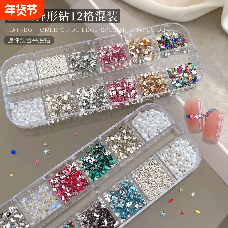 12格彩色异形钻美甲饰品迷你爆闪珍珠钢珠平底钻指甲配饰彩钻白钻