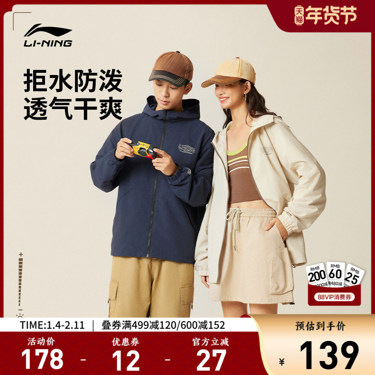李宁外套男女秋冬新款复古夹克轻薄连帽上衣印花潮流宽松运动风衣