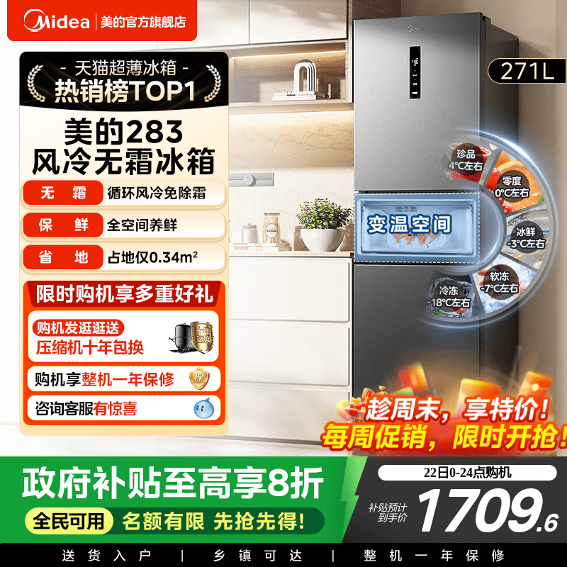 美的283三开门电冰箱一级能效家用变频风冷无霜小型超薄官方租房