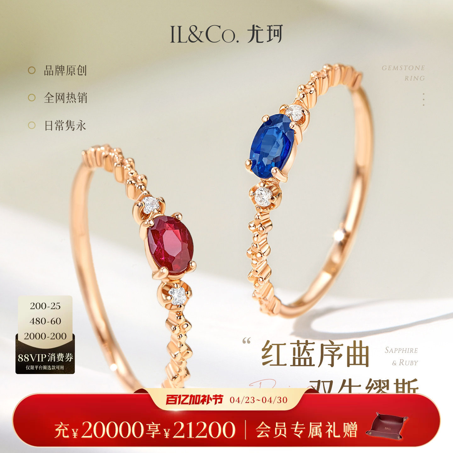 ILCO尤珂「蓝茶缪斯」18K玫瑰金天然蓝宝石戒指轻奢红宝石彩宝戒