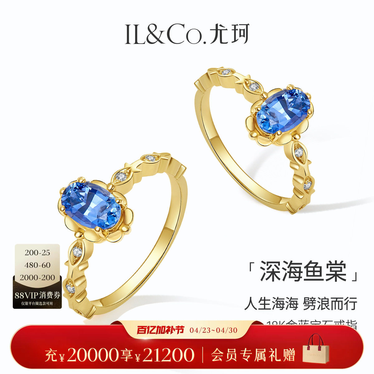 ILCO尤珂「深海鱼棠」18k金镶嵌天然蓝宝石戒指复古轻奢彩宝女款