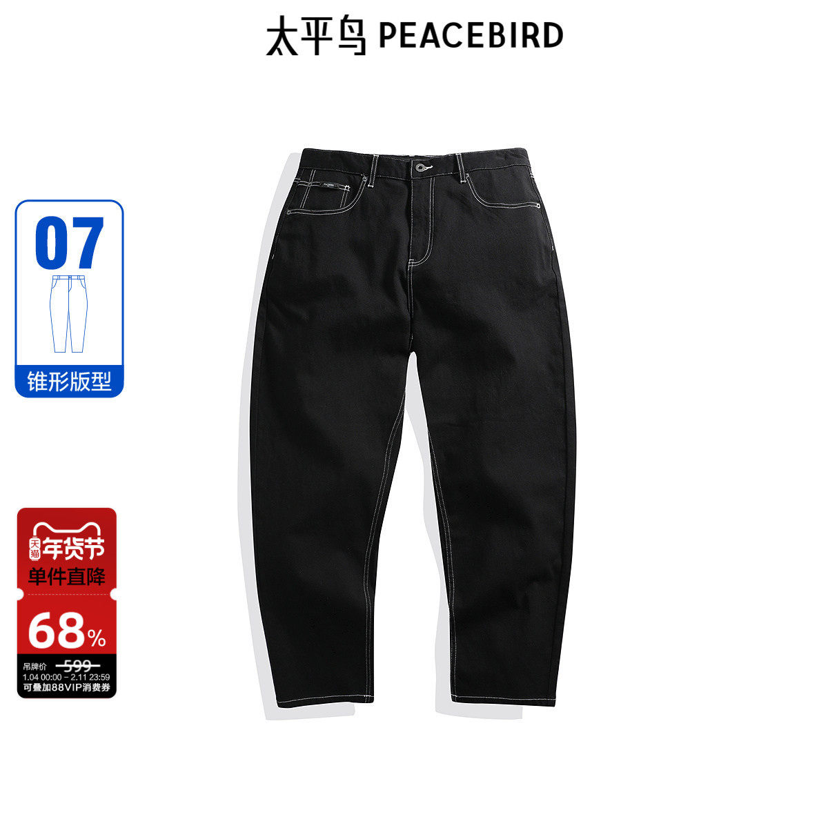 太平鸟男装水洗明线休闲复古牛仔裤锥形长裤黑色时尚牛仔长裤潮