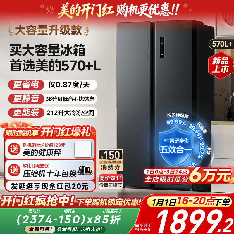 美的570+/606对开双开门两门大容量家用冰箱一级节能风冷无霜超薄