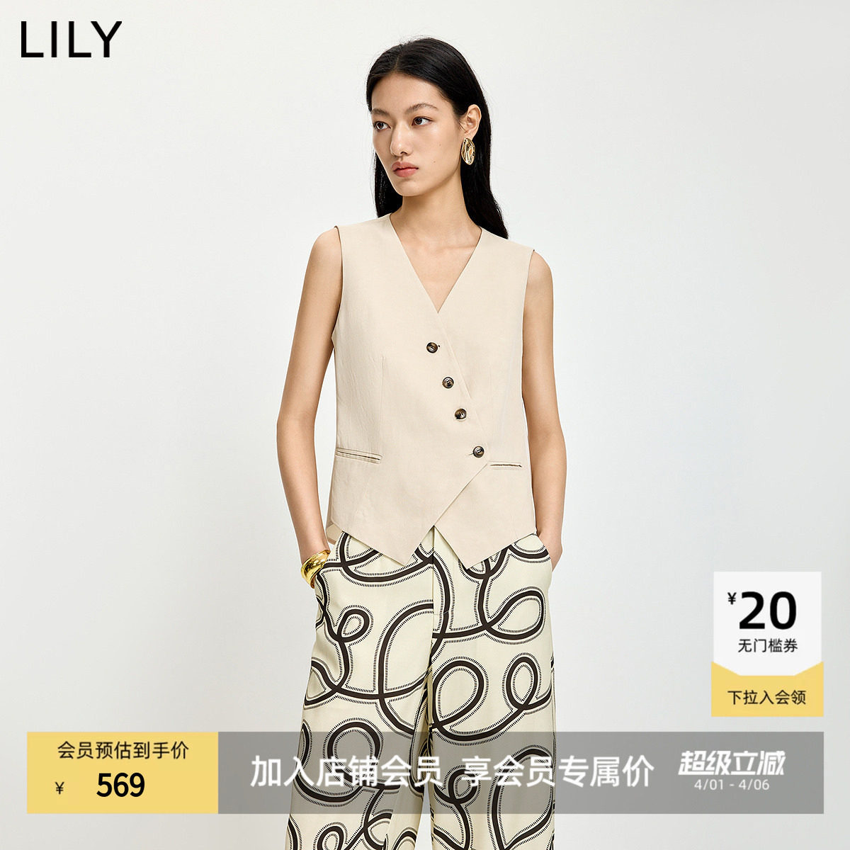 【商场同款】LILY2026夏新款女装含亚麻老钱风斜门襟V领西装马甲