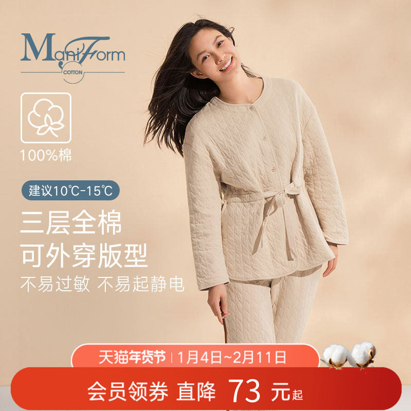 曼妮芬棉质生活冬季三层全棉睡衣女居家可外穿不易起静电棉家居服