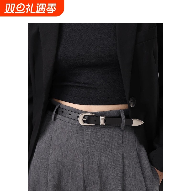 女士皮带针扣装饰设计感新款银色真皮小众时髦秋季配西裤腰带女黑