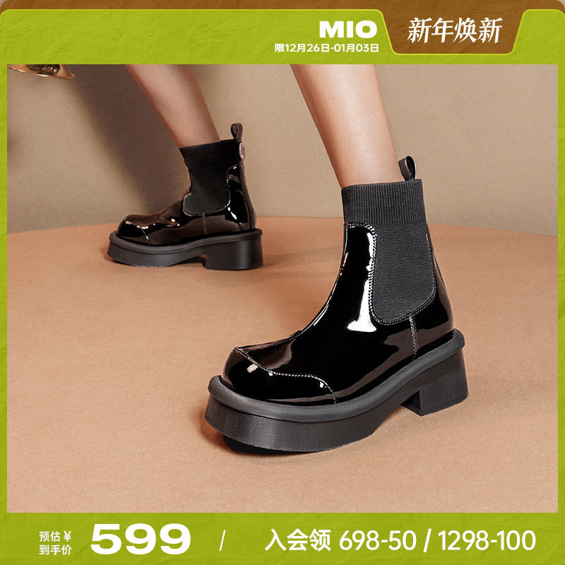 MIO米奥冬季方头中跟显高厚底切尔西靴时尚复古弹力拼接靴短筒靴