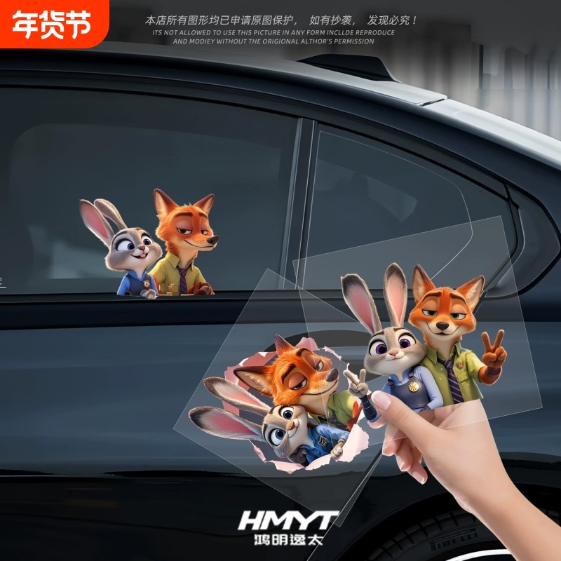 创意卡通狐狸和兔子汽车后车窗玻璃防水装饰贴纸车身划痕遮挡贴画
