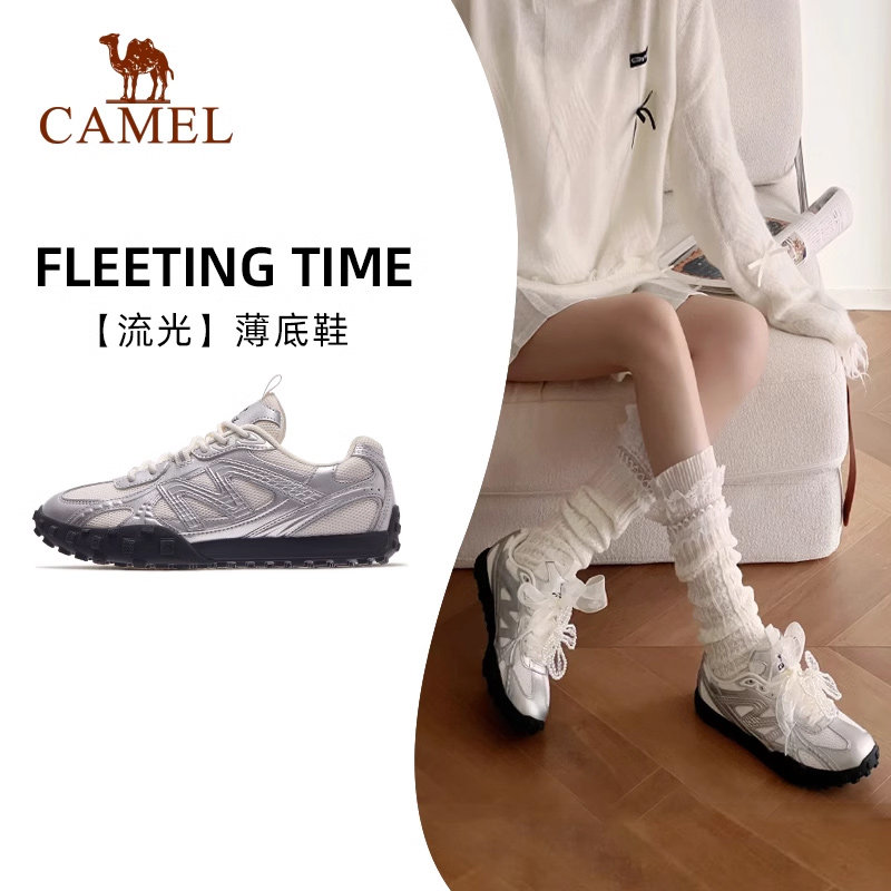 骆驼流光运动鞋女芭蕾风薄底鞋蕾丝银色复古德训鞋赛车鞋休闲板鞋