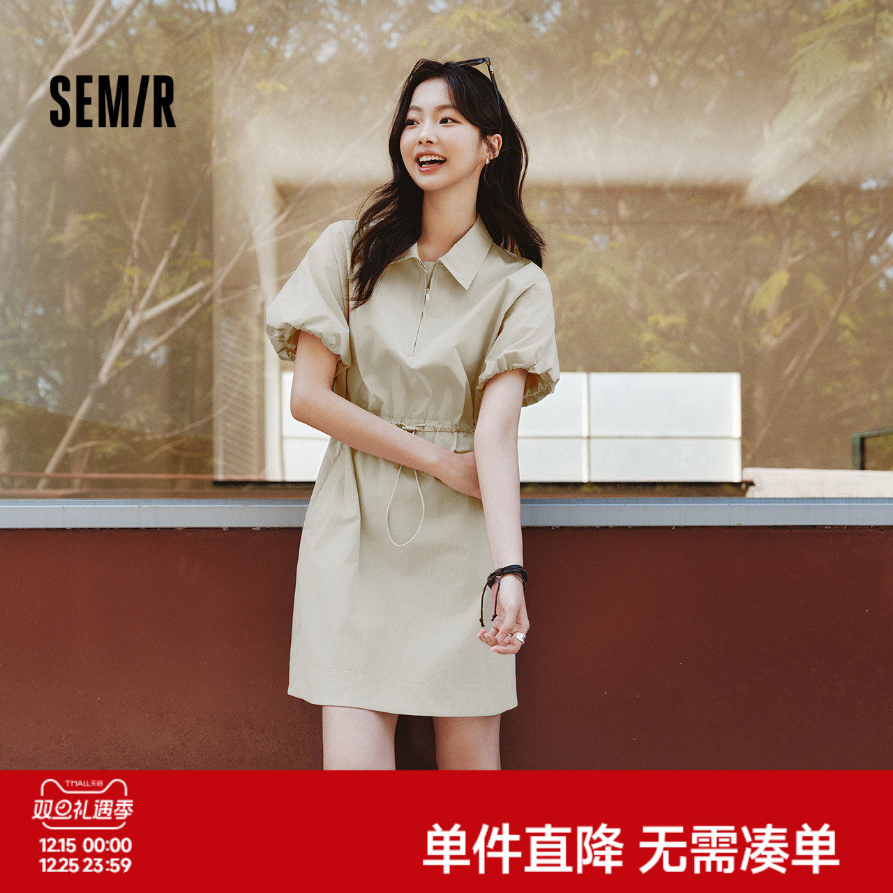 森马连衣裙女翻领灯笼袖盐系休闲风2025新款夏季防晒收腰短裙户外