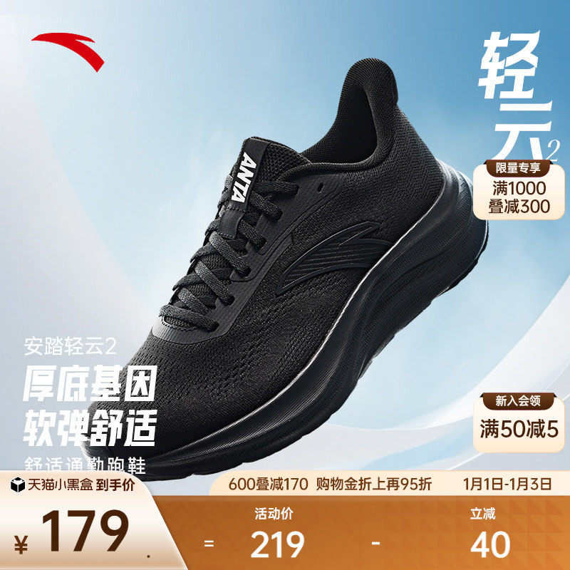安踏轻云2丨网面轻质跑步鞋男冬季耐磨黑色通勤运动鞋112535509R
