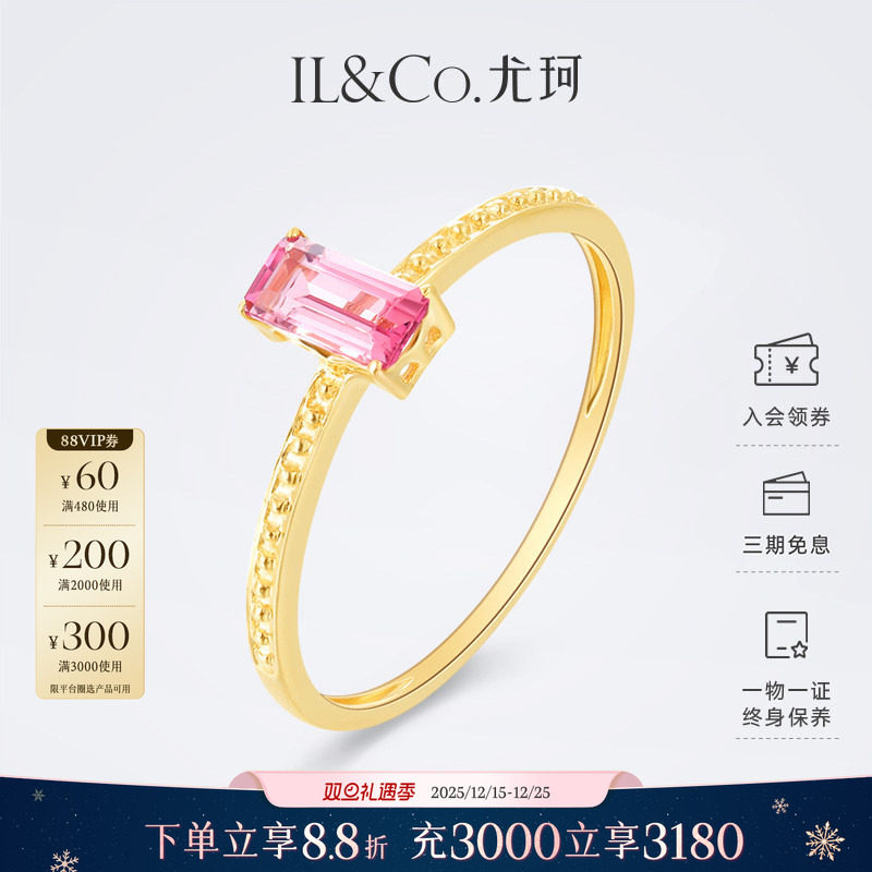 ILCO尤珂 天然粉红碧玺戒指海蓝宝18K金方形滚珠边镶彩金托帕石女