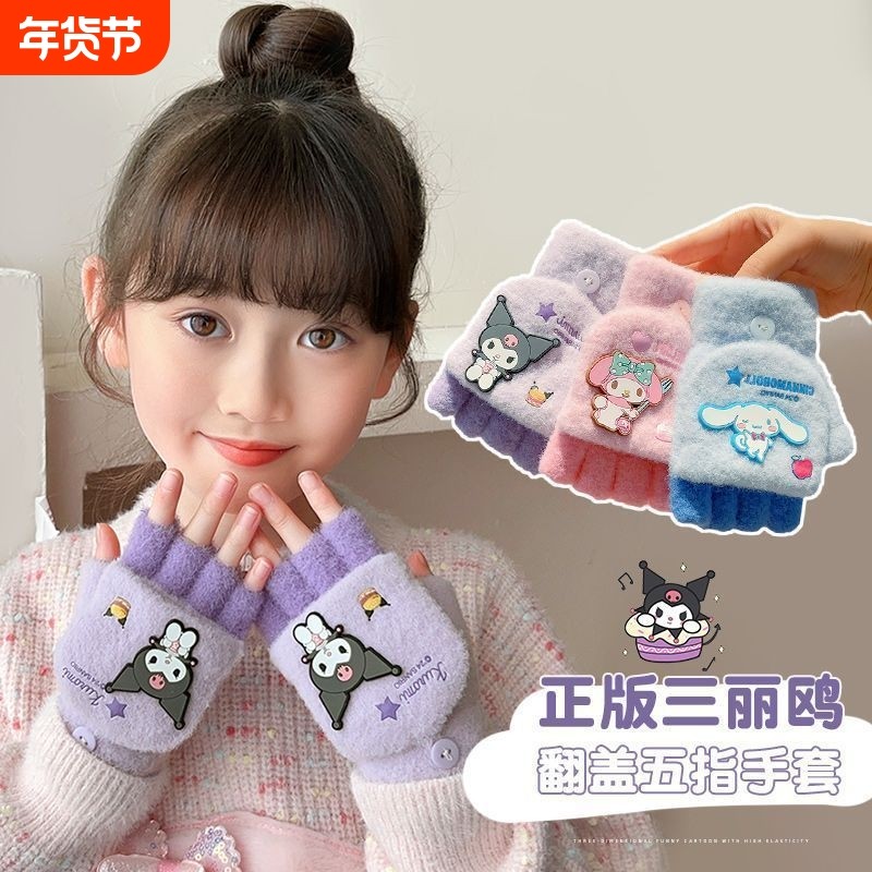 库洛米儿童手套冬季加厚毛绒五指套写字翻盖半指套宝宝冬天防冻手