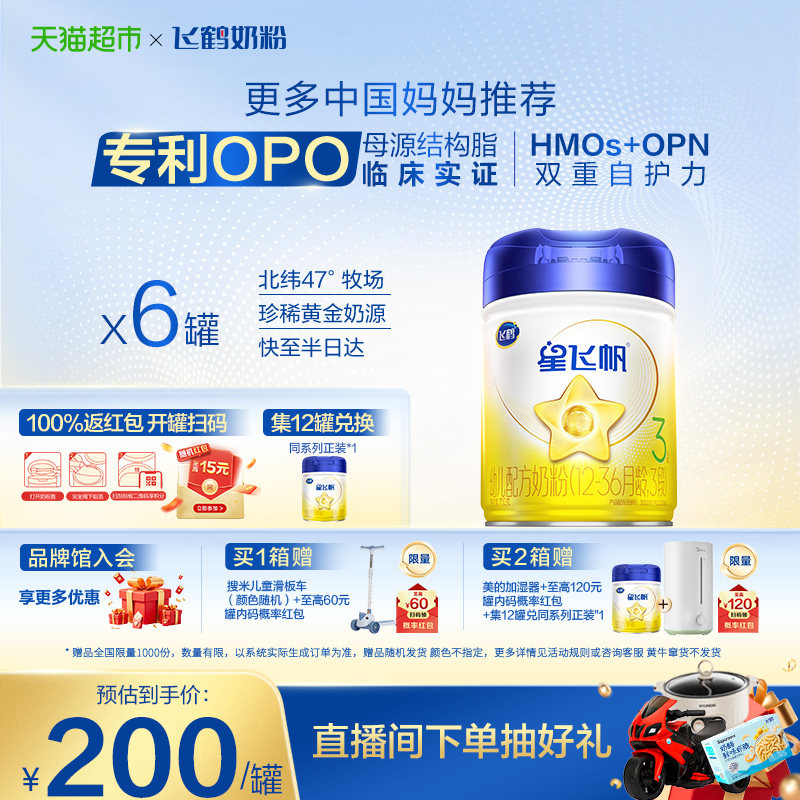 【官方正品】飞鹤星飞帆3段婴幼儿配方牛奶粉700g*6罐5HMO专利OP