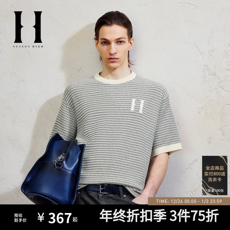SEASON HIGH纯棉宽松秋季针织短袖半袖T恤男装士半袖花织设计圆领
