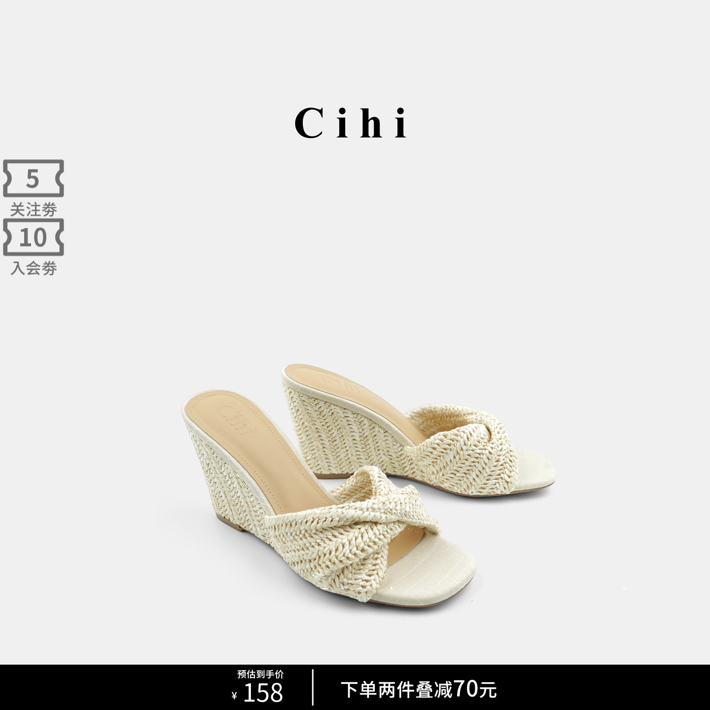 Cihi设计法式坡跟凉鞋女复古编织2025夏季新款露趾度假风外穿拖鞋