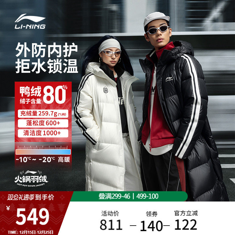 李宁火锅羽绒服丨男冬季鸭绒长款加厚上衣情侣防寒保暖衣服外套女