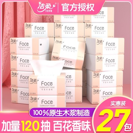 洁柔抽纸百花香味120抽3层可湿水面巾纸家用实惠装整箱纸巾餐巾纸