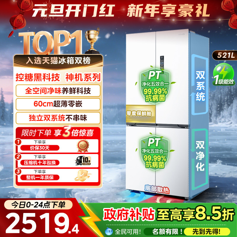 容声520L十字对开四门一级能效家用电冰箱超薄嵌入以旧换新补贴
