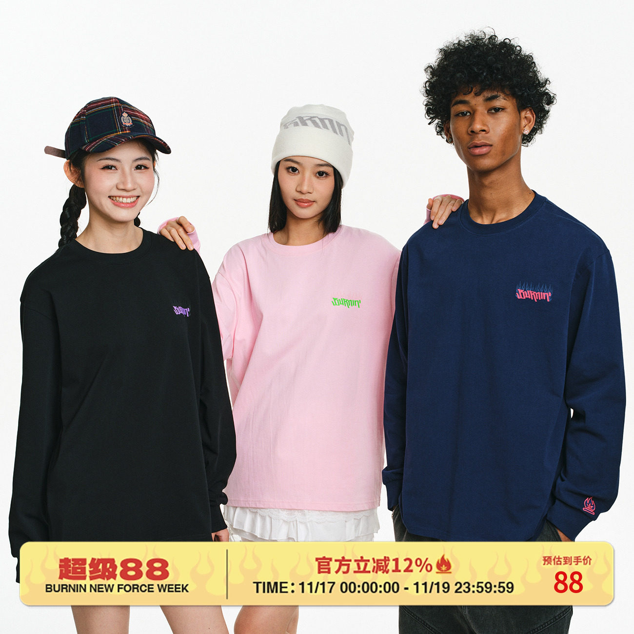 BURNIN*小火苗火焰横排长袖T恤男宽松美式街头加绒保暖打底衫上衣