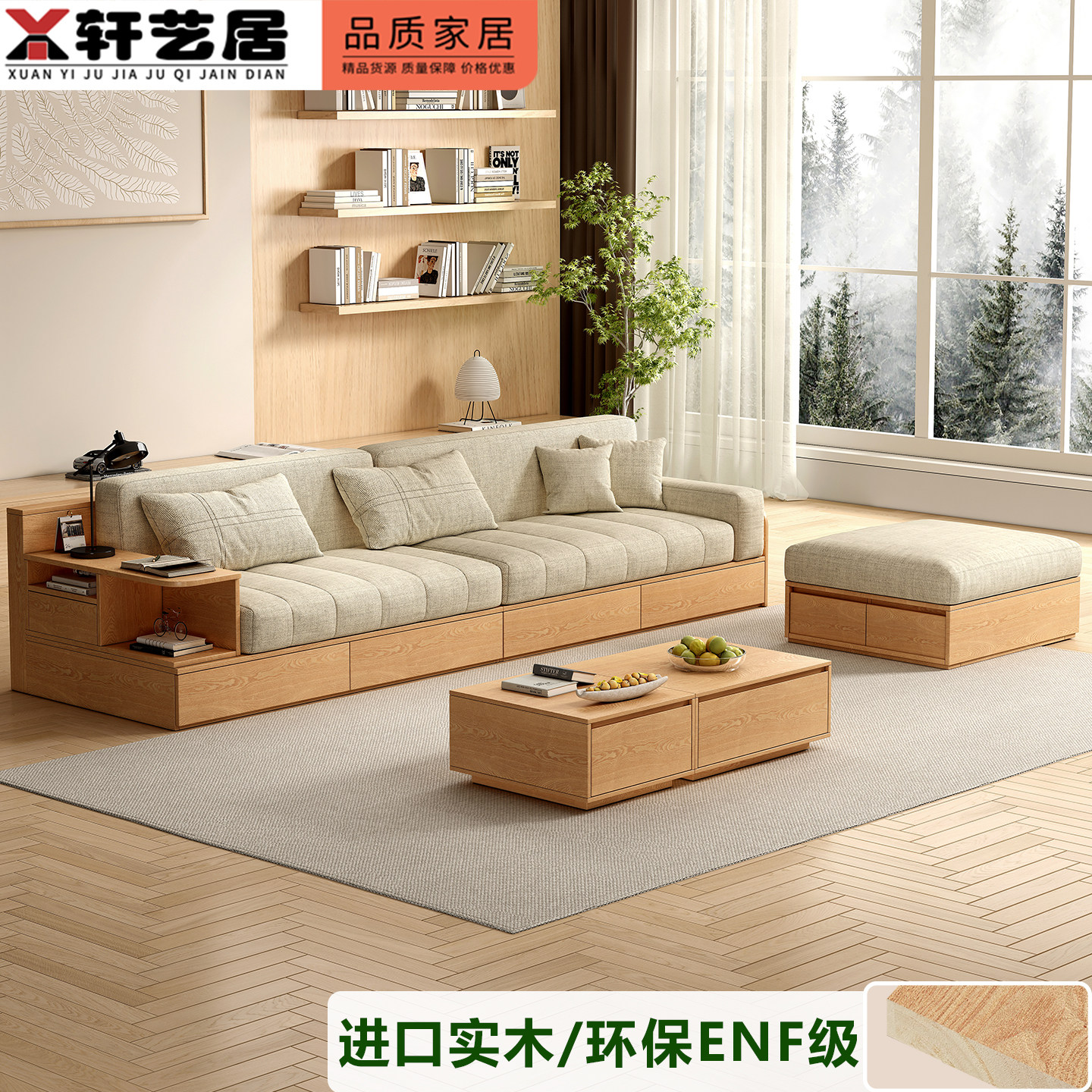 实木板式储物沙发小户型原木三人位抽屉客厅家具米色布艺拆洗沙发