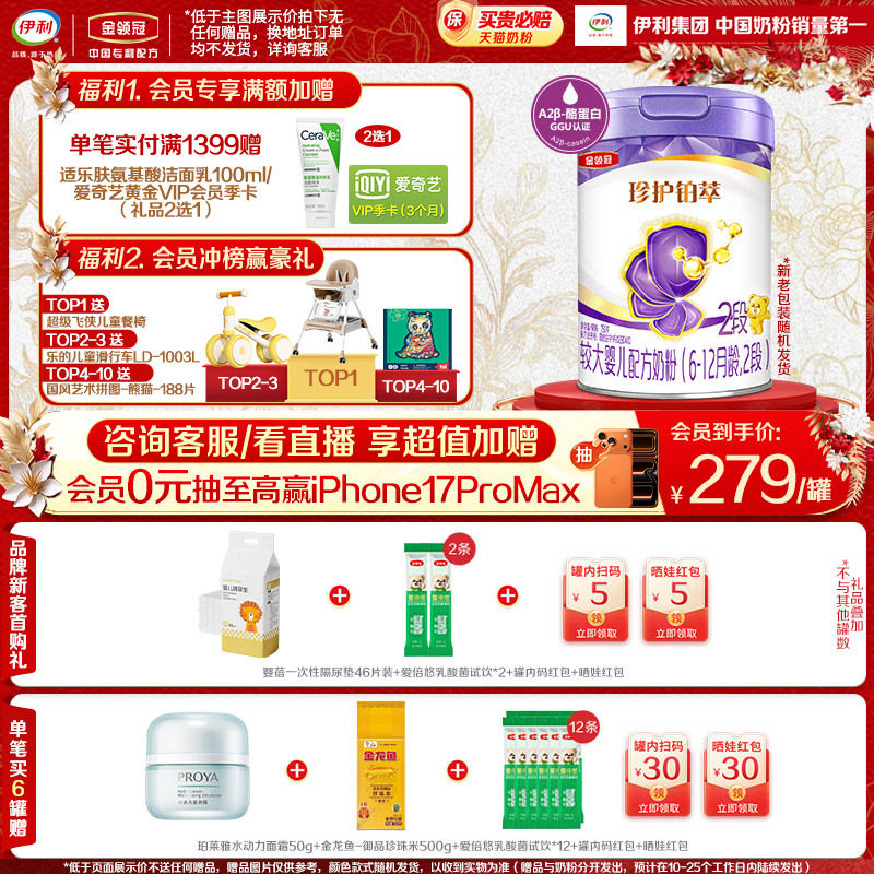 【90种全面营养】伊利金领冠珍护铂萃2段6-12月婴幼儿奶粉750g