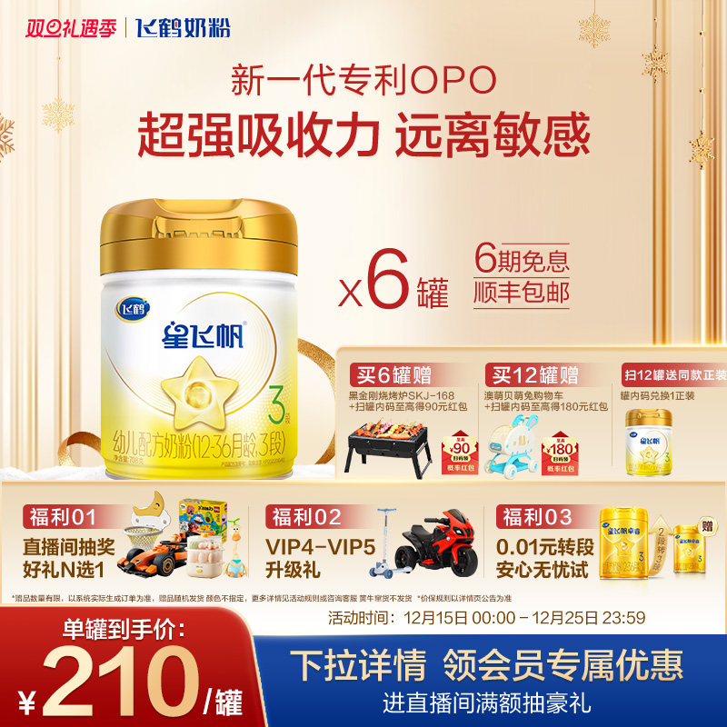 【官方正品】飞鹤星飞帆A2β-酪蛋白奶源3段婴幼牛奶粉708g*6罐