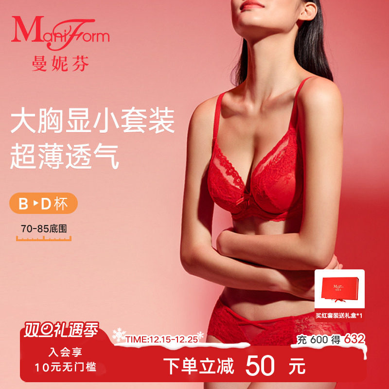 朱珠同款曼妮芬内衣女性感蕾丝超薄文胸套装大胸显小胸罩本命年红