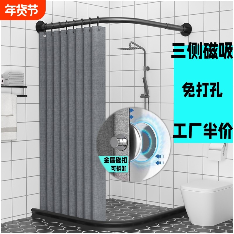 弧形浴帘套装免打孔浴室隔断防水防霉卫生间磁吸L形洗澡帘子挡水