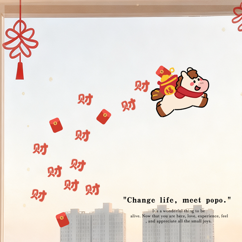 小马来财新年装饰玻璃贴防撞新春橱窗镜子贴纸马年窗花2026新款