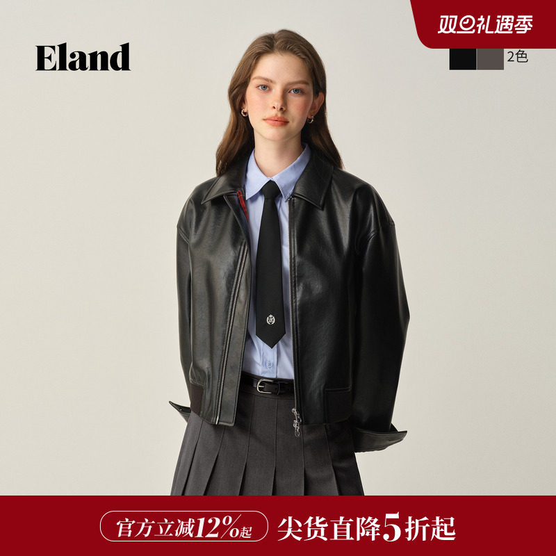 Eland衣恋皮衣女纯色带拉链长袖翻领外套2025冬季新款