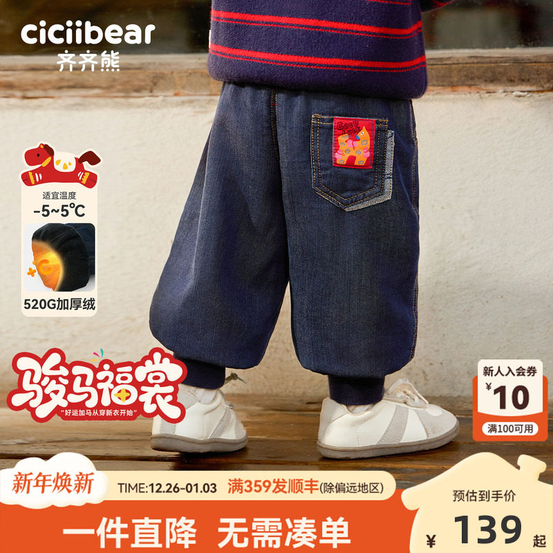 [骏马福裳520G]齐齐熊宝宝裤子加绒加厚冬款男童牛仔裤保暖裤新年