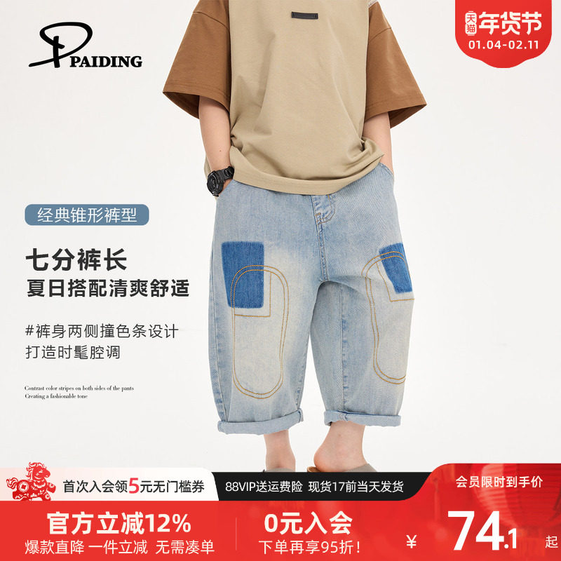 派町童装男童裤子儿童2025新款夏装水洗拼色牛仔七分裤中大童时髦