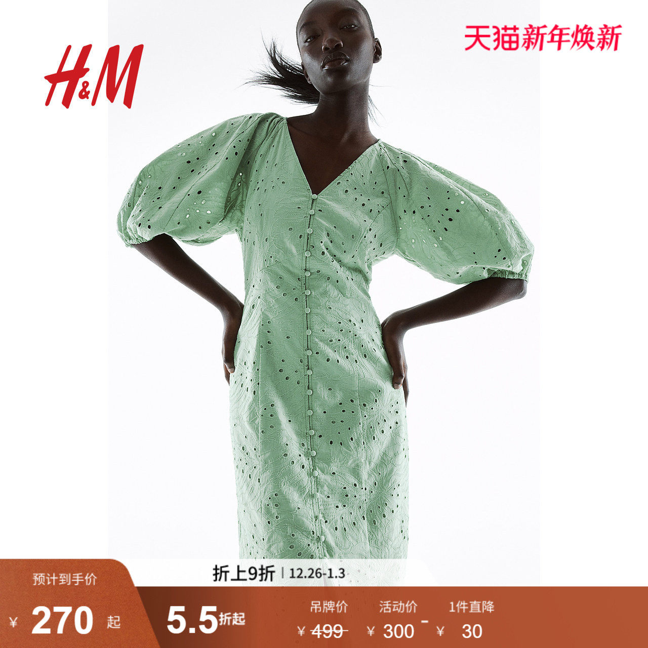 HM女装连衣裙冬季优雅V领灯笼袖中长连衣A字裙1229166