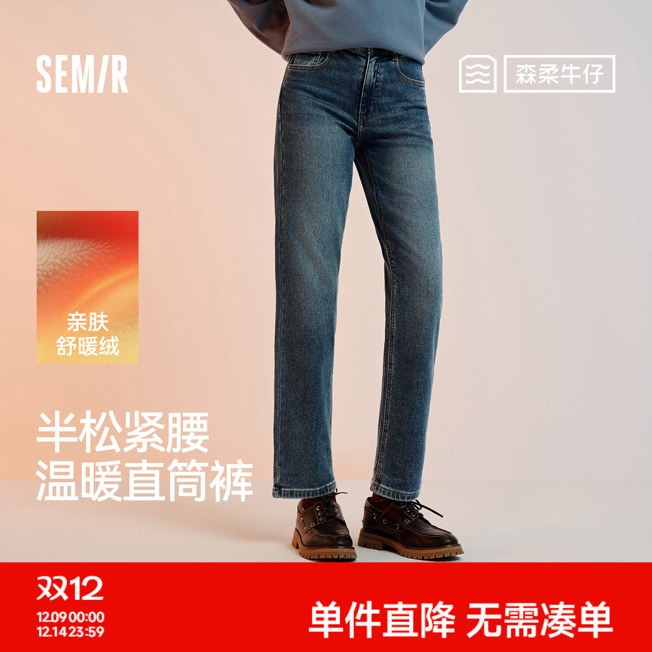 森柔牛仔|森马牛仔裤女抓毛长裤女生冬季半松紧腰直筒裤美式休闲