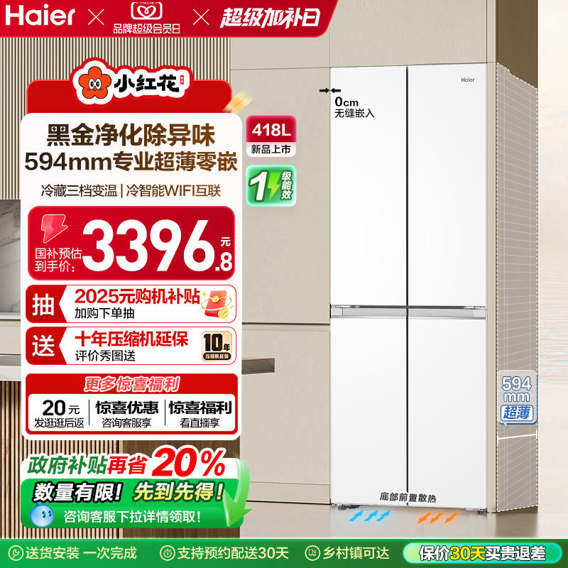 换新补贴海尔小红花418L双开四门超薄零嵌入家用风冷无霜一级冰箱