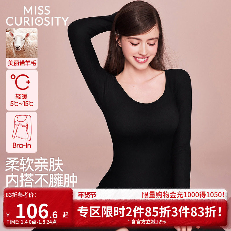好奇蜜斯羊毛保暖内衣女发热莫代尔肌底衣秋冬内搭带胸垫加绒秋衣