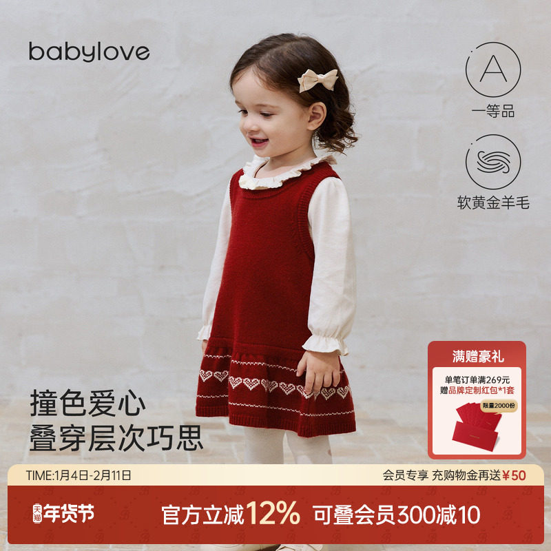 babylove女宝宝连衣裙秋冬羊毛针织拜年服洋气百搭裙子星空锈红