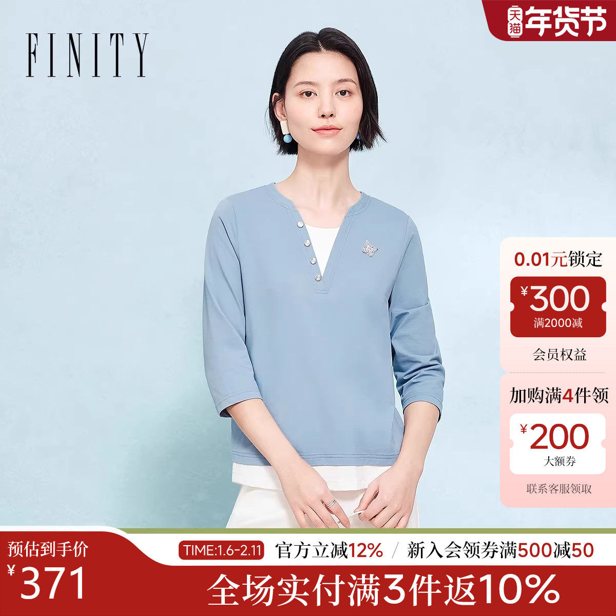 FINITY菲妮迪假两件T恤2025年秋季新款简约气质V领百搭撞色上衣女