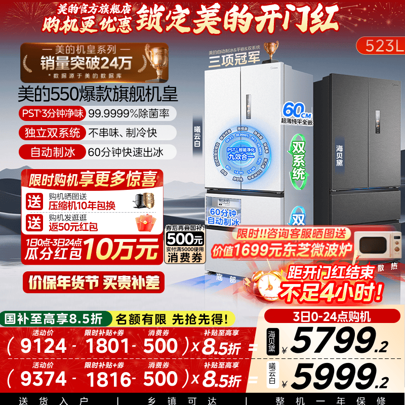 政府补贴美的M60机皇550零嵌入式双系统制冰冰箱家用法式双开四门
