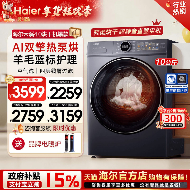 【云溪4.0】海尔热泵烘干机77E家用10公斤全自动变频干衣机旗舰店